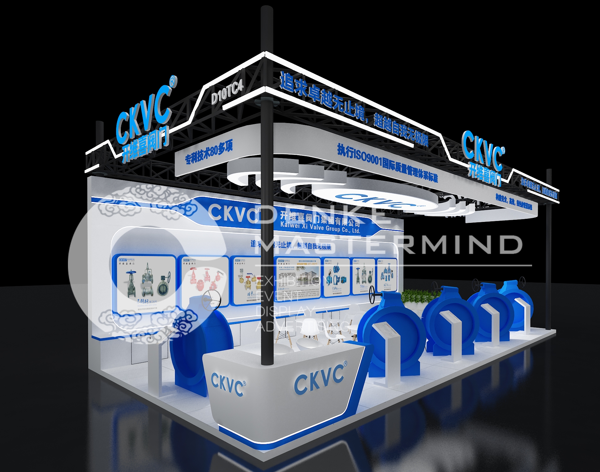 开维喜阀门集团作为国内的领先的阀门制造企业,开维喜阀门集团还担任中国阀协理事单位、中国建筑给排水、全国给排水技术情报网常务理事单位;也是中国城市煤气协会会员、国家电力系统、中国石油天然气、中石化物资资源阀门一级供应网络成员;中国化工装备总公司、中国化工装备总供、中石化集团公司分频定点推荐企业。我们结合企业的这些诉求,直接的把展位三个面放置展示的产品,然后背墙用大面积的展示灯箱的展览设计,直接的展示企业产品的参数信息,和企业的一些信息。门头的设计简单大气,发光的logo辨识度高,展览设计的大框架上用了发光灯带勾画出整体的科技效果。