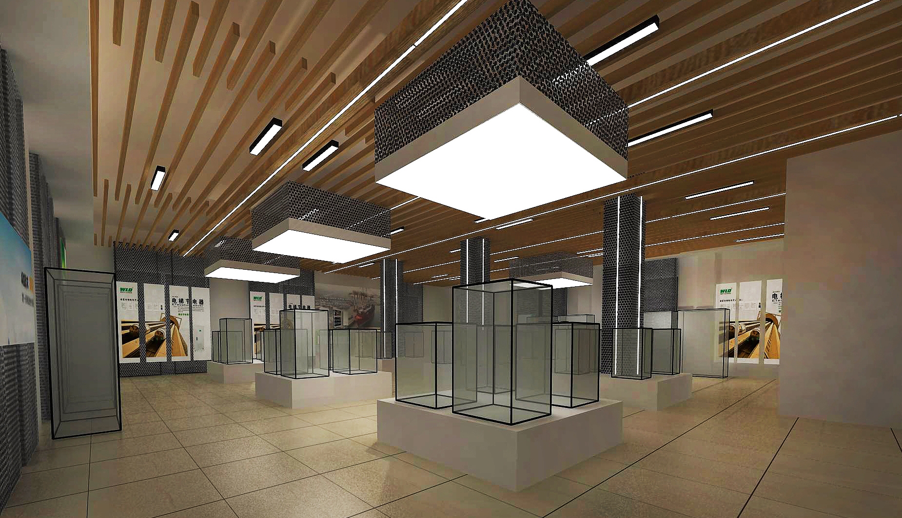功能布局:动线设计遵循 “参观 - 体验 - 交流” 的逻辑闭环,核心产品区以悬浮展台突出展品质感,互动体验区设置节能模拟装置,参观者可实时感受电气设备的低耗运行优势。整体空间无多余装饰,却通过材质碰撞与光影层次,