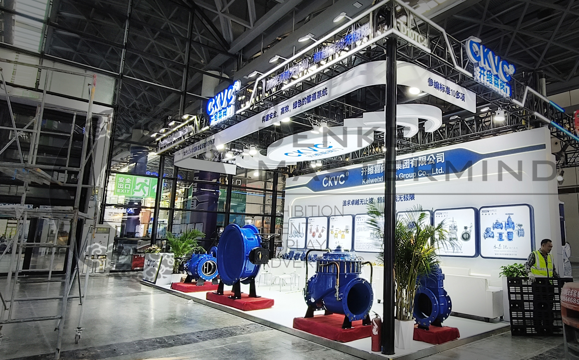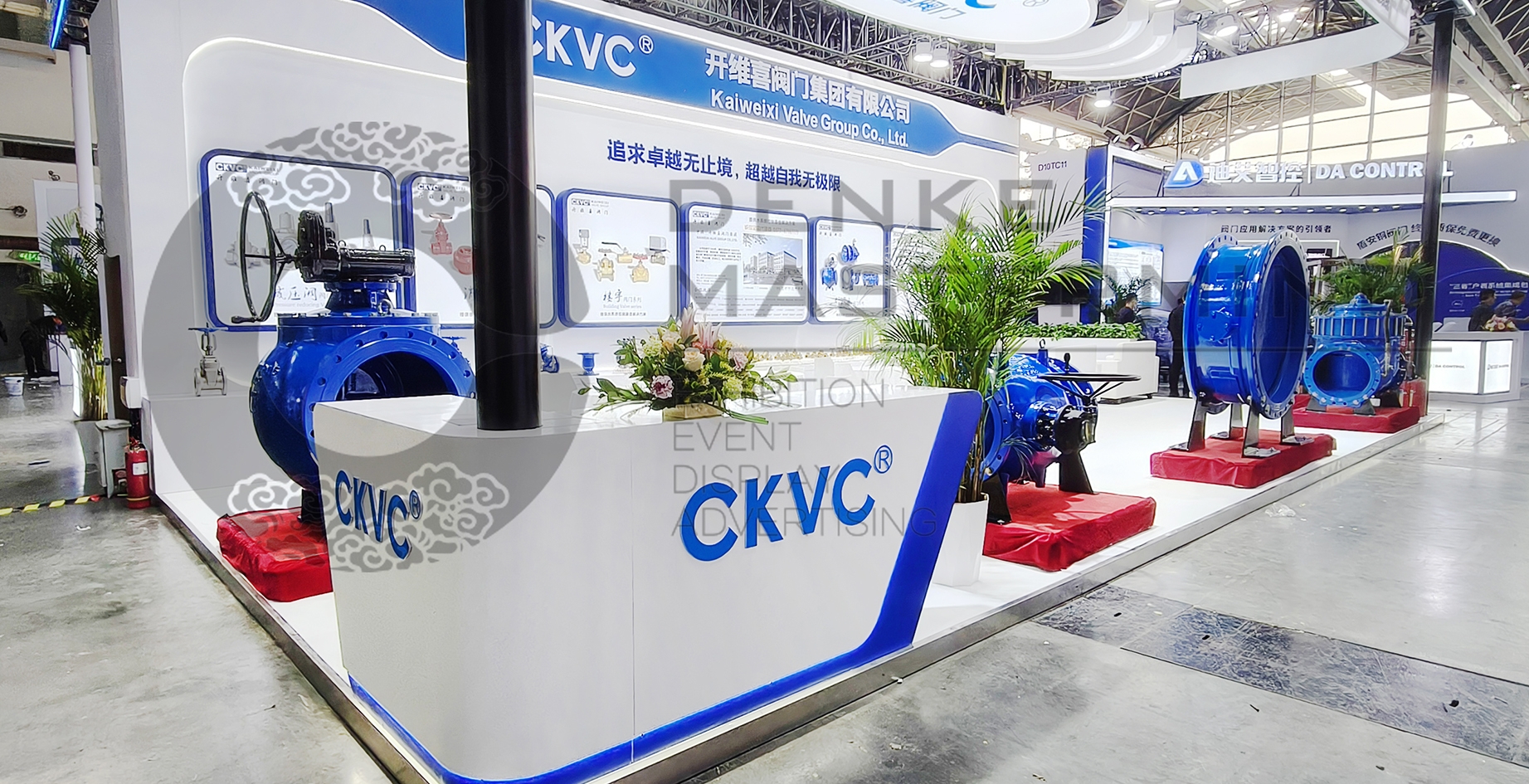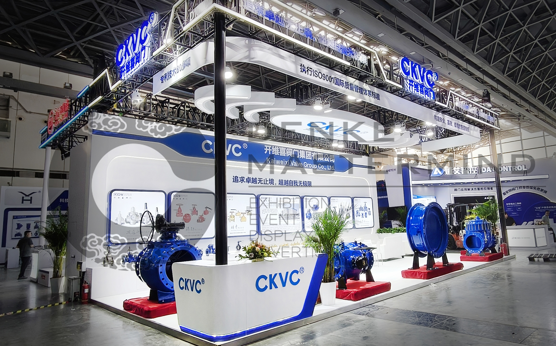 开维喜阀门集团作为国内的领先的阀门制造企业,开维喜阀门集团还担任中国阀协理事单位、中国建筑给排水、全国给排水技术情报网常务理事单位;也是中国城市煤气协会会员、国家电力系统、中国石油天然气、中石化物资资源阀门一级供应网络成员;中国化工装备总公司、中国化工装备总供、中石化集团公司分频定点推荐企业。我们结合企业的这些诉求,直接的把展位三个面放置展示的产品,然后背墙用大面积的展示灯箱的展览设计,直接的展示企业产品的参数信息,和企业的一些信息。门头的设计简单大气,发光的logo辨识度高,展览设计的大框架上用了发光灯带勾画出整体的科技效果。